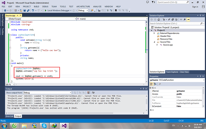 Sau đó biến lophoc gọi hàm setname để đặt tên và cout ra bằng hàm getname.