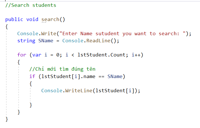 Bạn cho mình hỏi, Mình cũng có đề bài tương tự vậy nhưng phần tìm kiếm yêu cầu chỉ cần nhập nửa tên thôi thì sẽ list ra toàn bộ sinh viên có tên trùng với ký tự nhập vào.