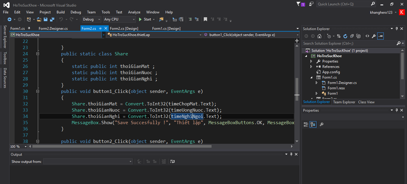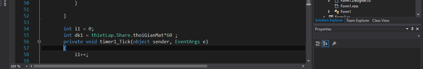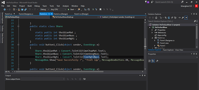 Mình debug thử solution, thấy biến thoiGianMat vẫn cập nhật giá trị bình thường khi bấm nút của form2. Còn form1 thì hoàn toàn không sử dụng đến biến đó…