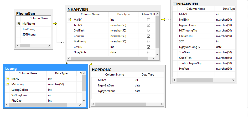 1- NhanVien với TTNhanViên mối quan hên 1-n là không đúng, không có người nào mà 2 nơi sinh cả…