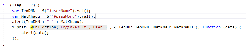Sau khi click vào đăng nhập vào nút đăng nhập , em dùng ajax với code sau để đẩy dữ liệu sang controller