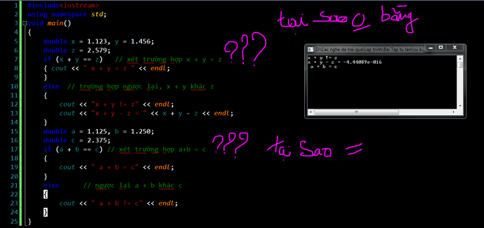 cái khó hiểu ở đây là phép tính ở trên, mình nhìn thấy bằng mà…tại sao nó không bằng…hixhixx, bức xức quá ,…mà khi trừ ra…nó lại bằng -4,44089x10-16 ( xấp xỉ gần bằng 0 ) ??? tại sao ???