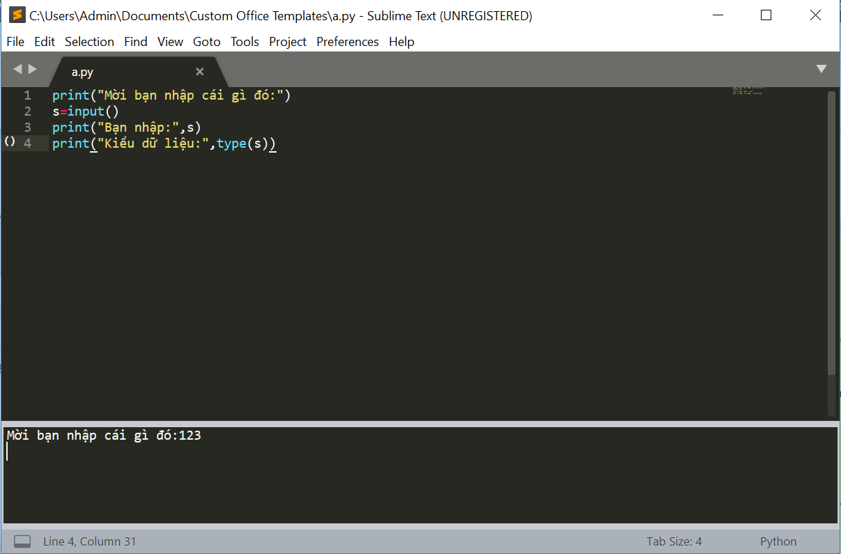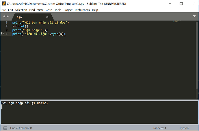 Em mới bắt đầu học python và đang mới sử dụng sublime text. Em đang tập bài nhập dữ liệu thì khi nhập từ bàn phím “123” hay bất kì chuỗi nào khác đều không có kết quả như mong đợi.