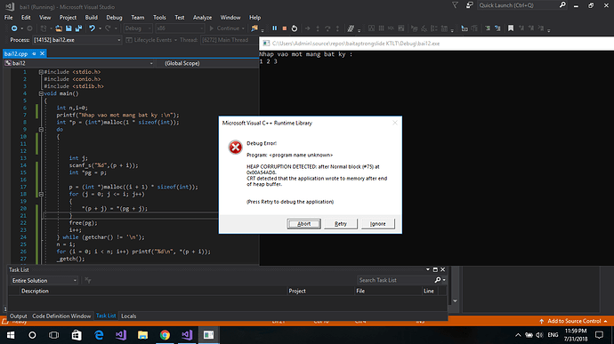 Khi e chạy thì hiện lỗi bộ đệm như vầy, nhưng ấn ignore thì kết quả out ra vẫn đúng !
