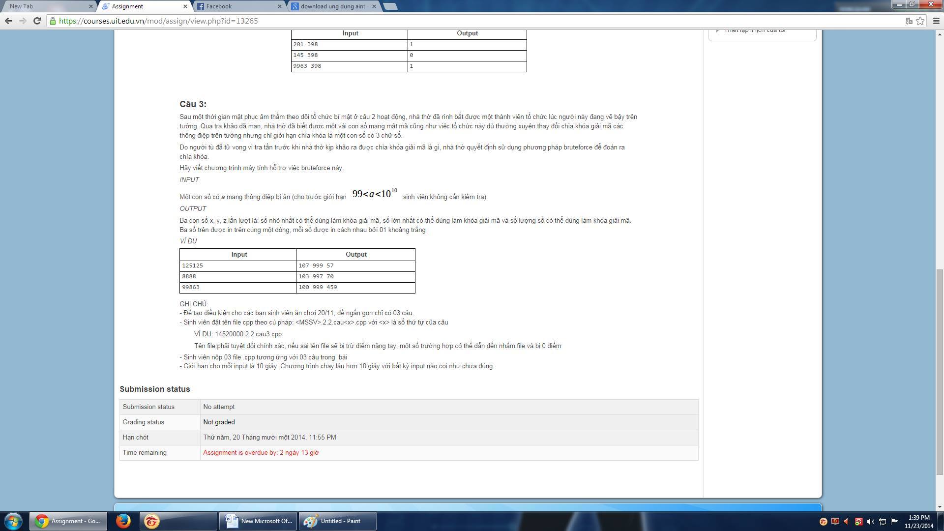 Ba con số x,y,z lần lượt là số nhỏ nhất có thể dùng làm khóa giải mã, số lớn nhất có thể dùng làm khóa giải mã và số lượng con số có thể dùng làm khóa giải mã.(ba số in cùng 1 dòng cách nhau 1 khoảng trắng)