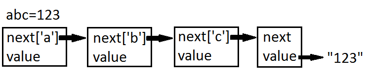 Mình sẽ đưa từng ký tự của phần key trong file ini vào biến next, đến ký tự cuối thì lưu phần value vào biến value để xây dựng data structure. Khi chuyển đổi thì đọc từng ký tự trong chuỗi đầu vào và tìm dần dần vào sâu trong biến next, khi không còn ký tự nào để vào sâu nữa thì biến value chính là chuỗi đích để chuyển đổi.