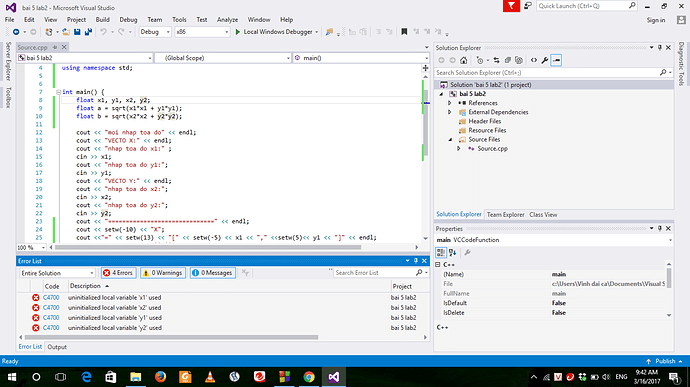 Bạn sử dụng các biến trước khi nó được khởi tạo giá trị thì sai là đúng rồi. dòng float a float b phải khai báo (đồng thời khởi tạo) sau khi nhập xong các giá trị.