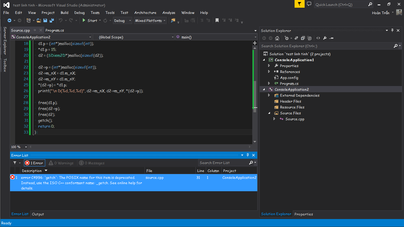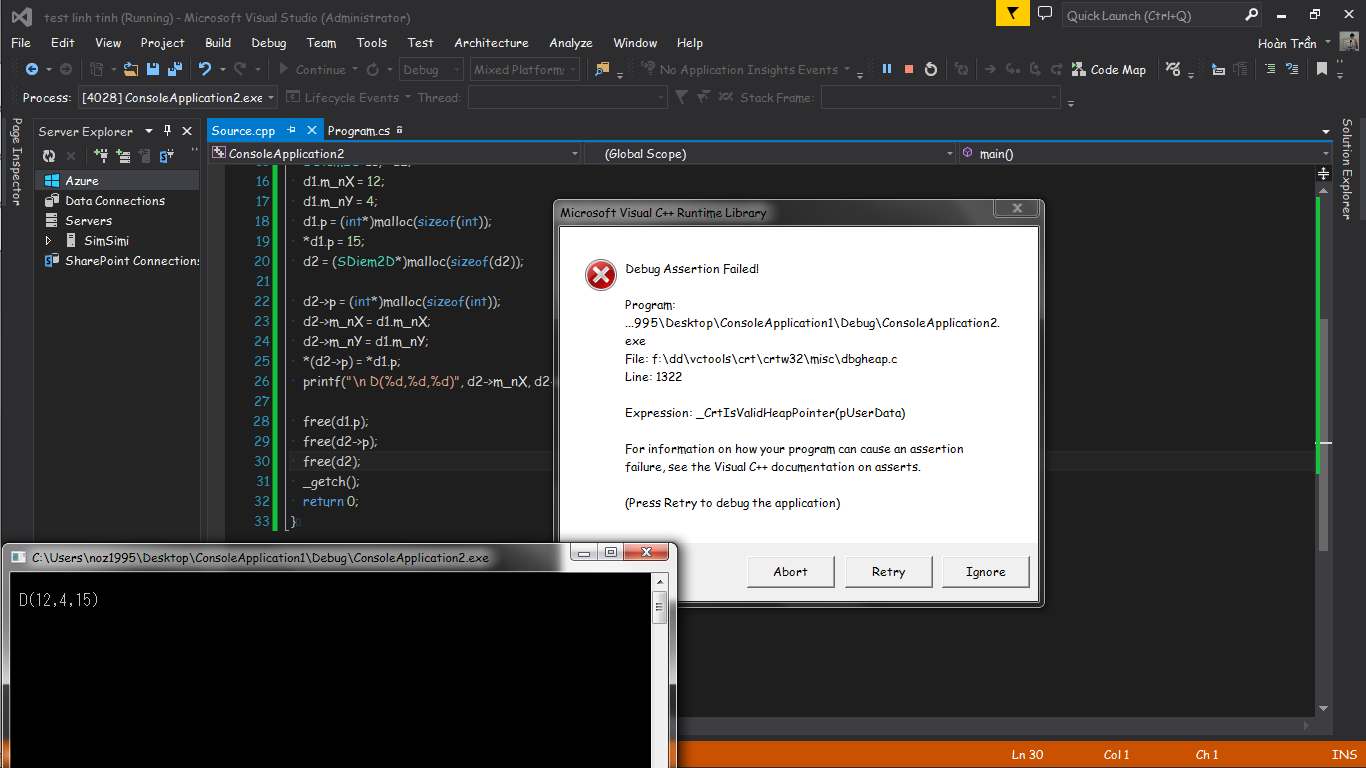 tuy chạy được nhưng lại có thông báo “cảnh báo”(VS 2010). Chỉ khi bỏ giải phóng con trỏ thì chương trình mới chạy bình thường.Xin cho em hỏi chương trình trên bị gì? Xin cảm ơn!