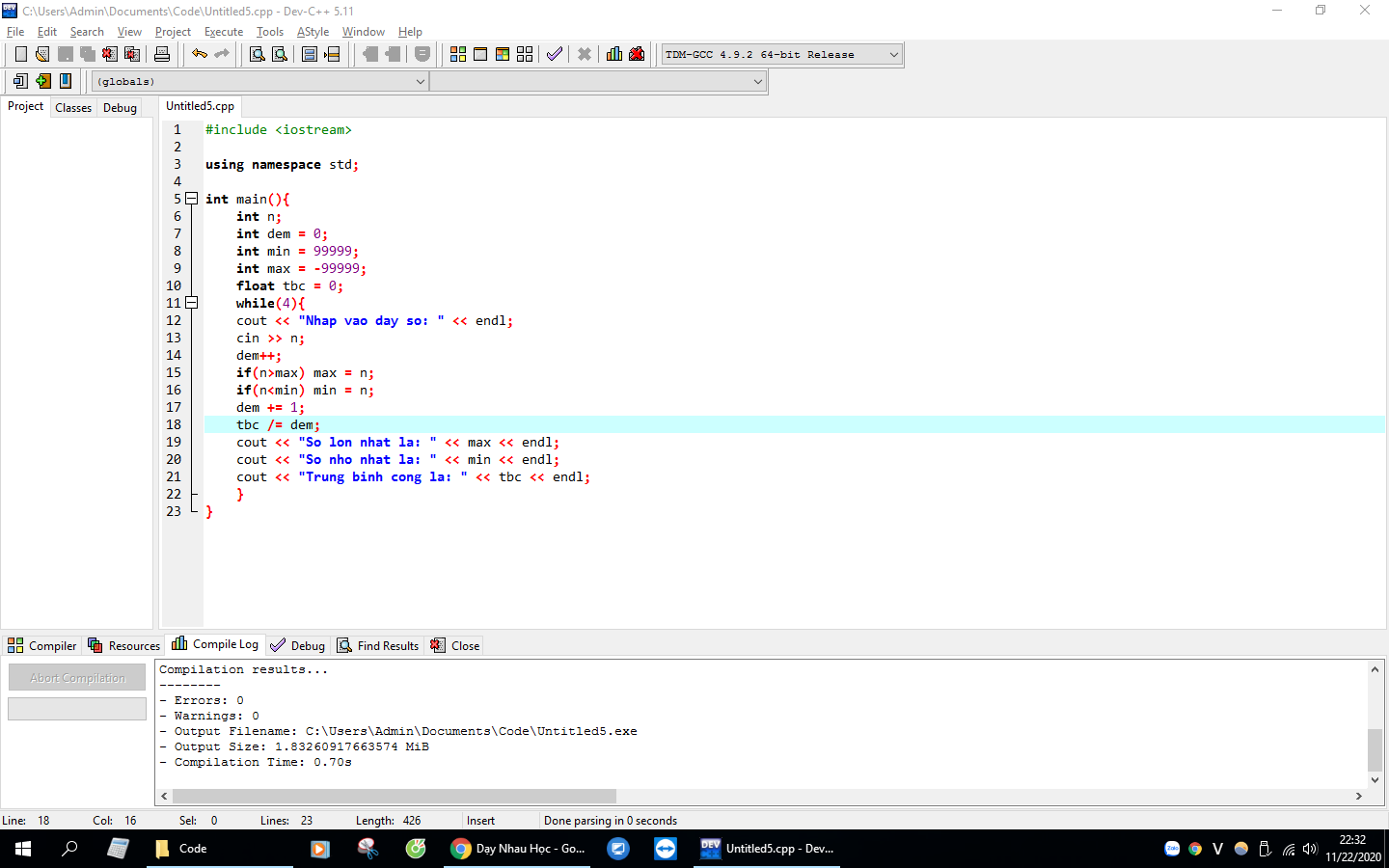 tbc /= dem + in ra ngay trong vòng lặp là không ổn rồi.