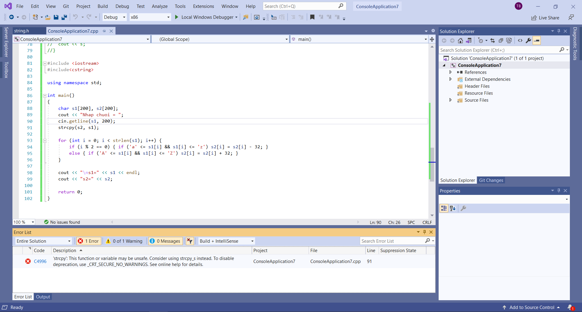 em đang viết code C hay code C++ :V C++ thì xài std::string cho chuỗi chứ ko xài mảng kí tự nha :V
