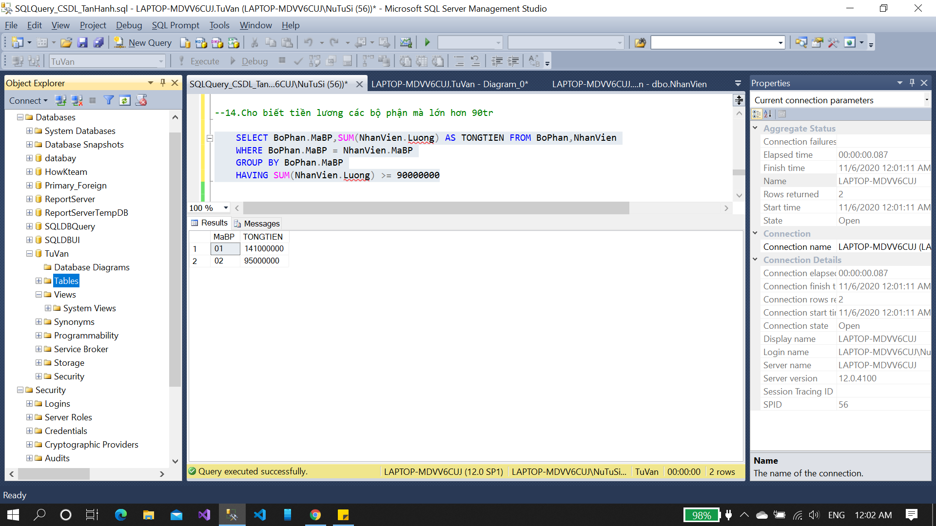 Câu lệnh truy vấn KHÔNG sử dụng tên mới tạo “TONGTIEN” và cho ra kết quả