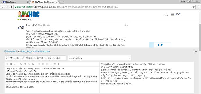 Để hiện code chính xác thì bạn bôi đen rồi bấm vào nút </>.
