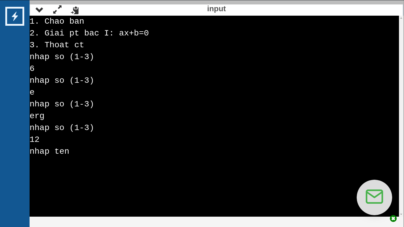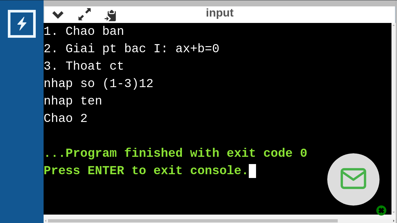 printf("1. Chao ban\n 2. Giai pt bac I: ax+b=0\n 3. Thoat ct\n");