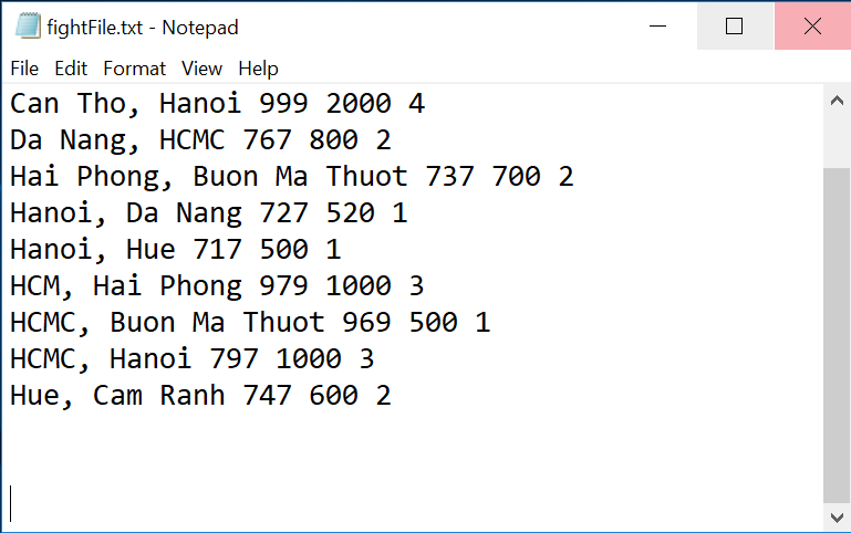 Nhờ mọi người chỉ giúp mình cách đọc và tách từng thành phần trong file để lưu thông tin vào từng thành phần tương ứng trong struct. Mình cũng đã đọc khá nhiều hướng dẫn trên các diễn đàn nhưng ở đó họ chỉ làm với cùng kiểu dữ liệu hoặc mỗi thành phần trong file đều ngăn cách nhau bởi dấu phẩy. Trường hợp của mình là chỉ có 1 dấu phẩy để ngăn cách tên 2 thành phố, những thông tin còn lại chỉ cách nhau bằng khoảng trắng. Cảm ơn mọi người rất nhiều.