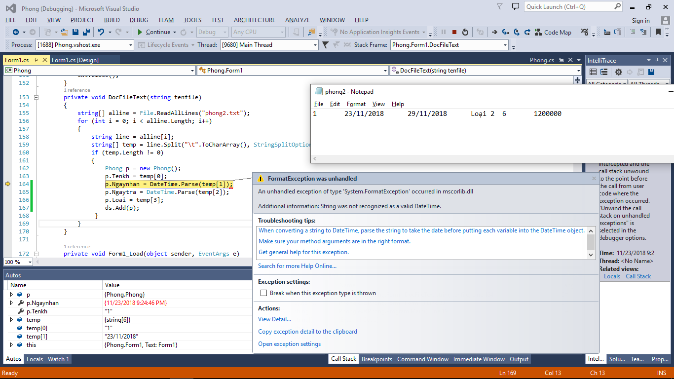 Chào mn, mình làm bài tập về file text trong C#, mình ghi file thi thành công, nhưng khi đọc file lên thì nó báo lỗi chỗ ngày tháng. Mong mn giúp đỡ ạ,