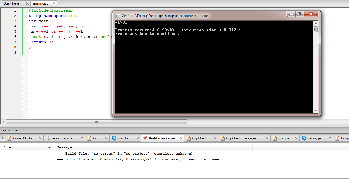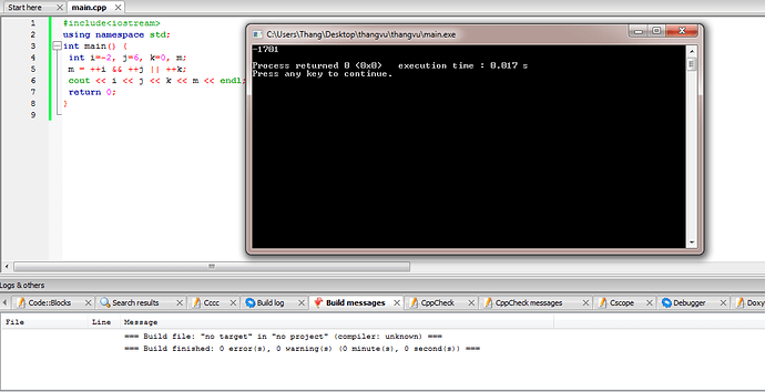 Mọi người cho em hỏi ý nghĩa của dòng lệnh m = ++i && ++j || ++k; trong đoạn code này ạ. Em cảm ơn.