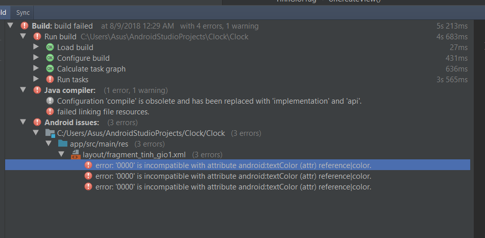 Mở fragment_tinh_gio.xml lên sửa. Nếu không sửa bằng giao diện thì mở dạng văn bản tìm đến chỗ có thuộc tính android:textColor và có giá trị là 0000 sửa cho đúng lại.