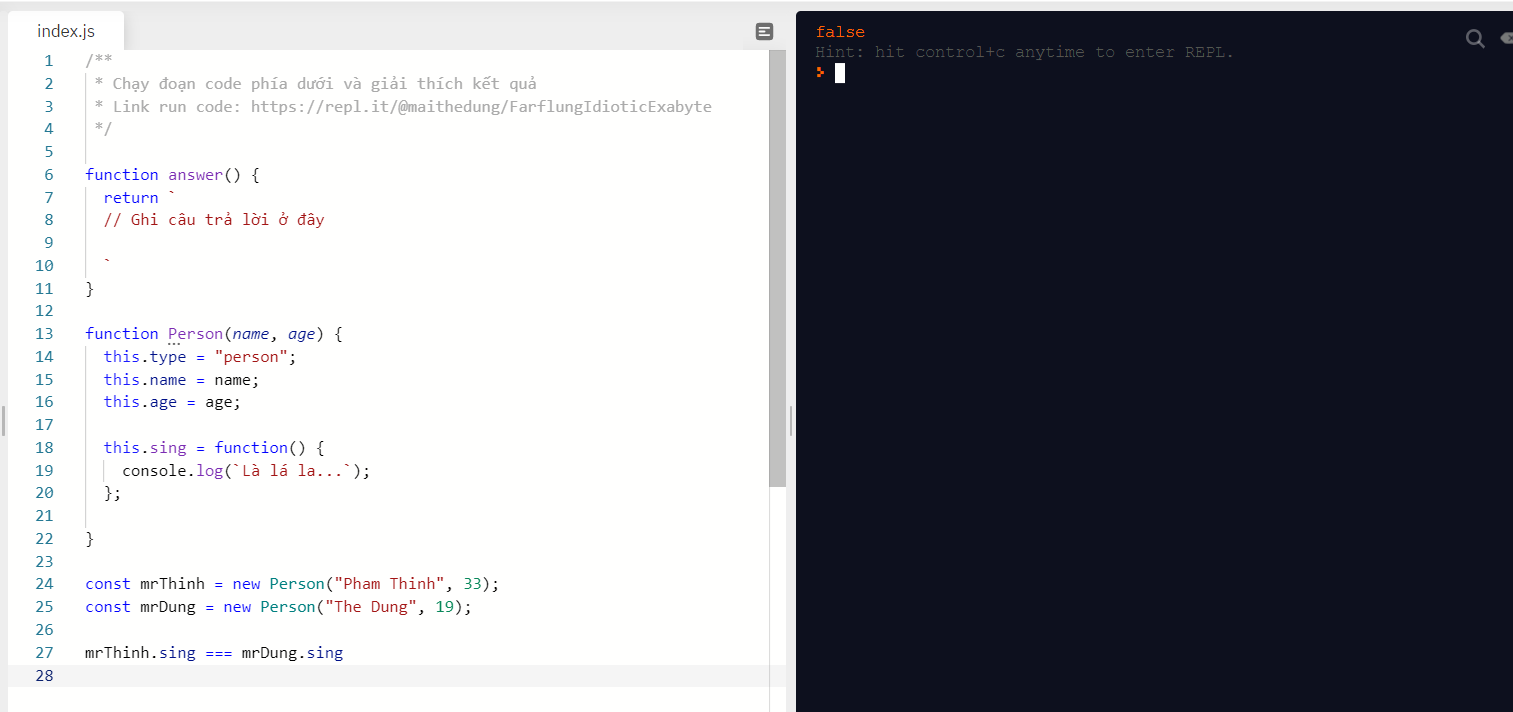 Mọi người có thể giúp em giải thích tại sao đoạn code này lại ra false với ạ. Em cảm ơn ạ!