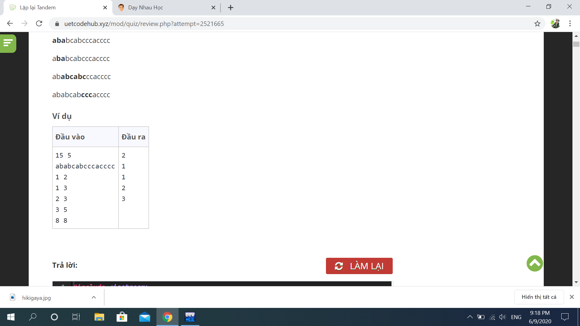 Cho một xâu S độ dài N chỉ gồm các chữ cái tiếng Anh viết thường (a-z). Bạn cũng được cho M dòng các xâu con [i, j] (1<=i<=j<=N).