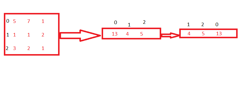2. Sắp xếp giá trị của mảng tổng theo chiều tăng dần, trong khi sắp xếp thì tạo một mảng lưu chỉ số của hàng.