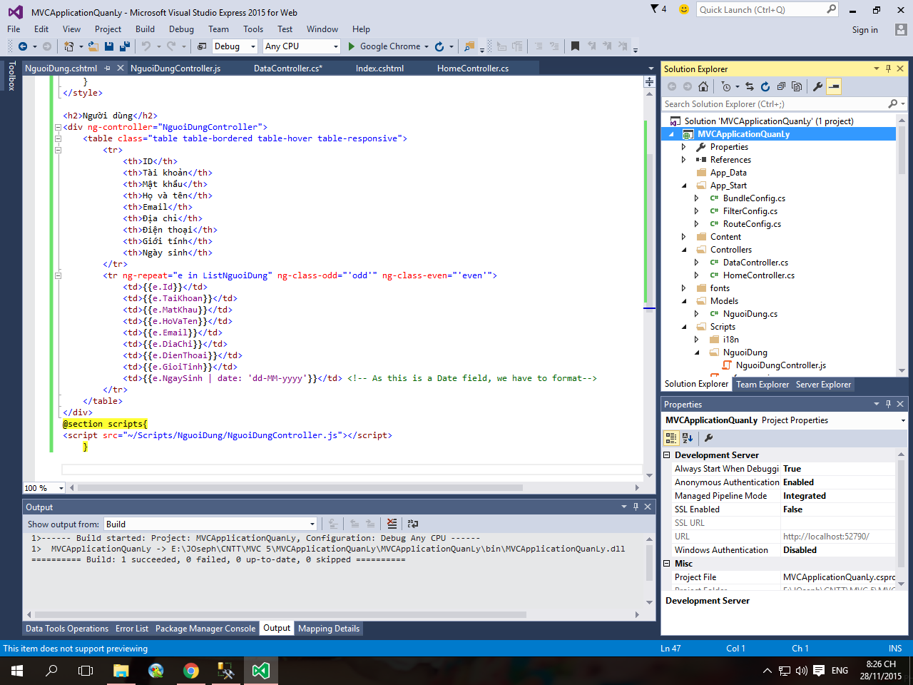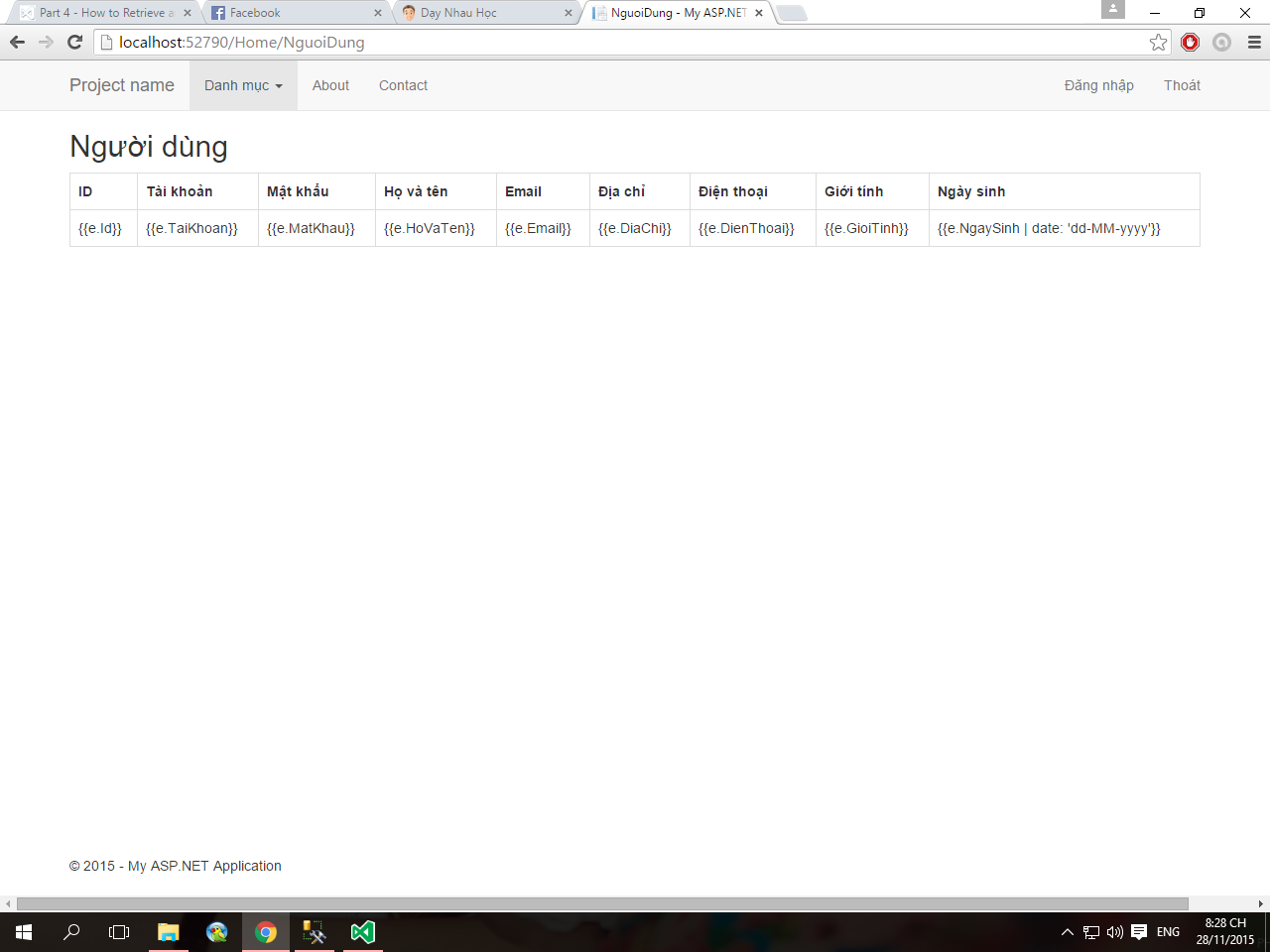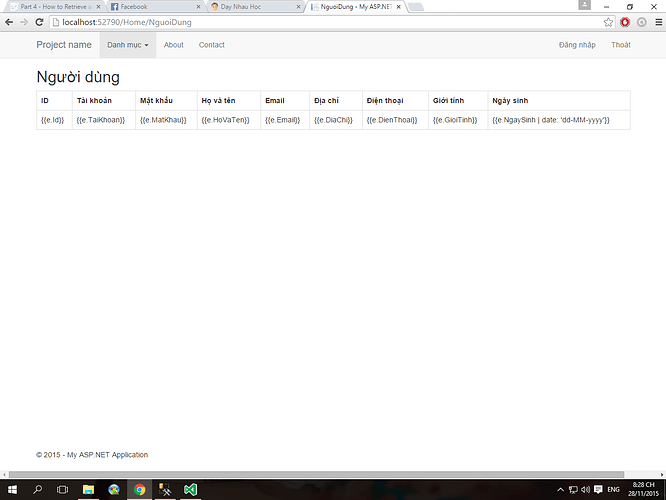 Mình từng làm theo ví dụ với entity framework thì nó lại ra. Nhưng khi mình chuyển sang lấy dữ liệu bằng SQL thì nó lại bị như vậy. Mình không biết nó bị sai chỗ nào. Mình debug thì nó cũng không chạy vào cái hàm GetNguoiDung() trong DataController. Xin hãy giúp mình với!
