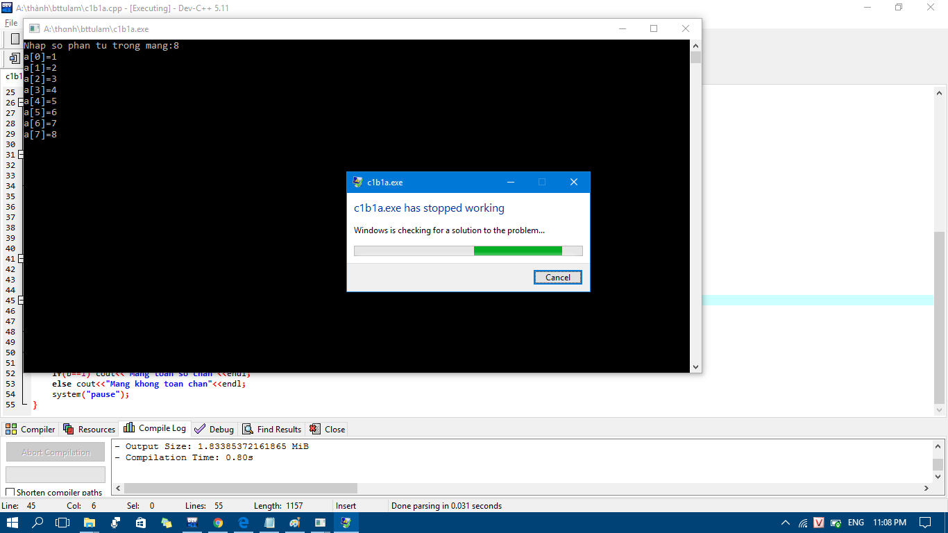 Lỗi trong lúc thực thi thôi, lỗi do code, không phải tại Windows hay Dev-Cpp đâu