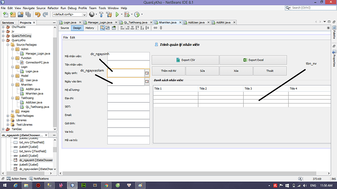 Em đang làm một đề tài về quản lý kho! Chỗ xử lý ngày tháng thì em dùng JDateChooser chọn nhày để up lên csdl thì được còn việc click chuột vào các dòng trên tbl_nv để hiển thị ra thông tin về ngày của nhân viên từ đó mình có thể chỉnh sửa thông tin nhân viên thì không biết làm thế nào!