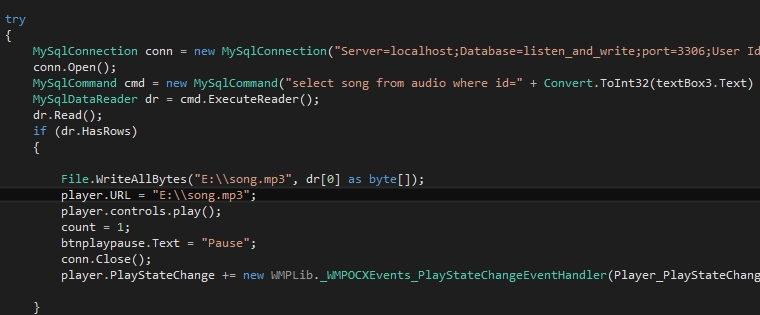nhưng ở đây nó đọc từ dr rồi ghi dữ liệu ra 1 file mới E:\song.mp3 rồi mới dùng đường dẫn đó để đọc bằng window media player,. Vậy cho e hỏi có cách nào để đọc trực tiếp dữ liệu từ dr rồi gán vào window media player mà k cần tạo ra 1 file mới để lưu k ạ?