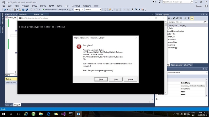 Em đang làm 1 bài tập liên quan tới mảng 1 chiều,mọi chức năng đều thuận lợi cho tới khi em thoát chương trình thì bị lỗi sau:
