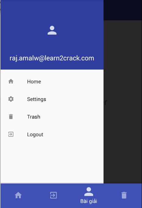Do cách bố trí layout của bạn thôi… Root layout sẽ là DrawerLayout bên trong đó gồm hai child layout: FrameLayout và NavigationView(dùng cho navigation drawer).