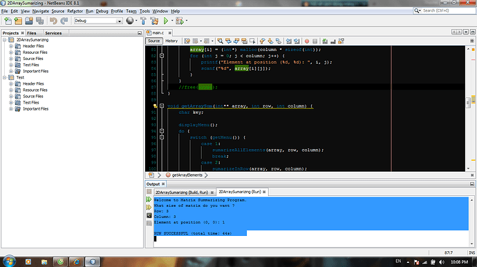 Dưới đây là bài code của em em muốn nhập một ma trận có kích thước row x column từ bàn phím, rồi tính tổng các thành phần trong ma trận, tổng trên một cột , tổng trên một hàng, em dùng một mảng hai chiều để chứa các giá trị nhưng khi đưa vào hàm tính tổng thì hàm không nhận được giá trị của mảng. Em không hiểu lỗi này ạ, ai giải thích giúp em.
