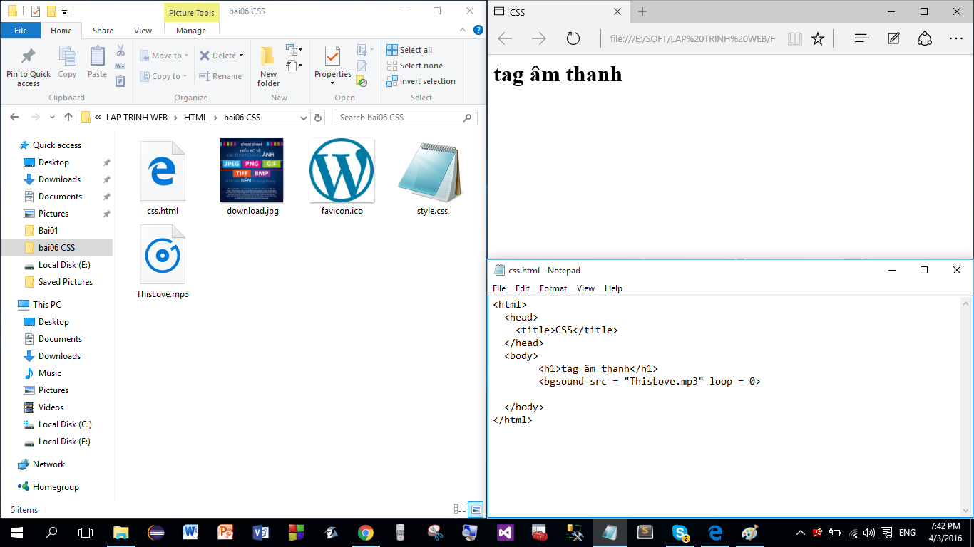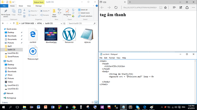 Mình muốn dùng tag bgsound để làm nhạc nền, nhưng sao load lên không nghe được nhạc nền, code như hình bên dưới: