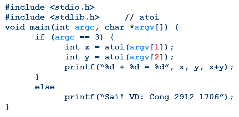 Cho em hỏi vd em có một chương trình sử dụng tham số hàm main như sau: