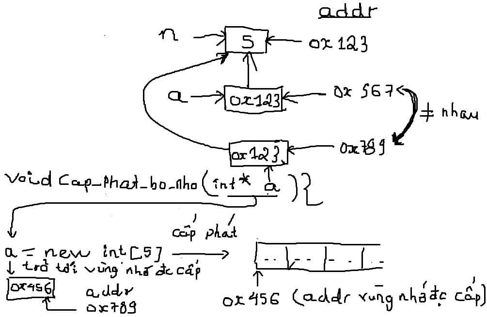 n có địa chỉ là 0x123 mang giá trị là 5. a có địa chỉ là 0x567 mang giá trị 0x123 (địa chỉ của n). Khi chương trình gọi hàm cap_phat_bo_nho(a) thì compiler sẽ tạo một vùng nhớ giống hệt con trỏ a đã khai báo ở trên tức là nó trỏ đến n (mang giá trị 0x123 như trong hình), nhưng vùng nhớ này hoàn toàn phân biệt với con trỏ a (nằm ở địa chỉ 0x789) truyền vào hàm. Và trong thân hàm cap_phat_bo_nho thực hiện thay đổi giá trị của vùng nhớ này (trỏ tới địa chỉ 0x456)…Sau khi ra khỏi hàm, con trỏ