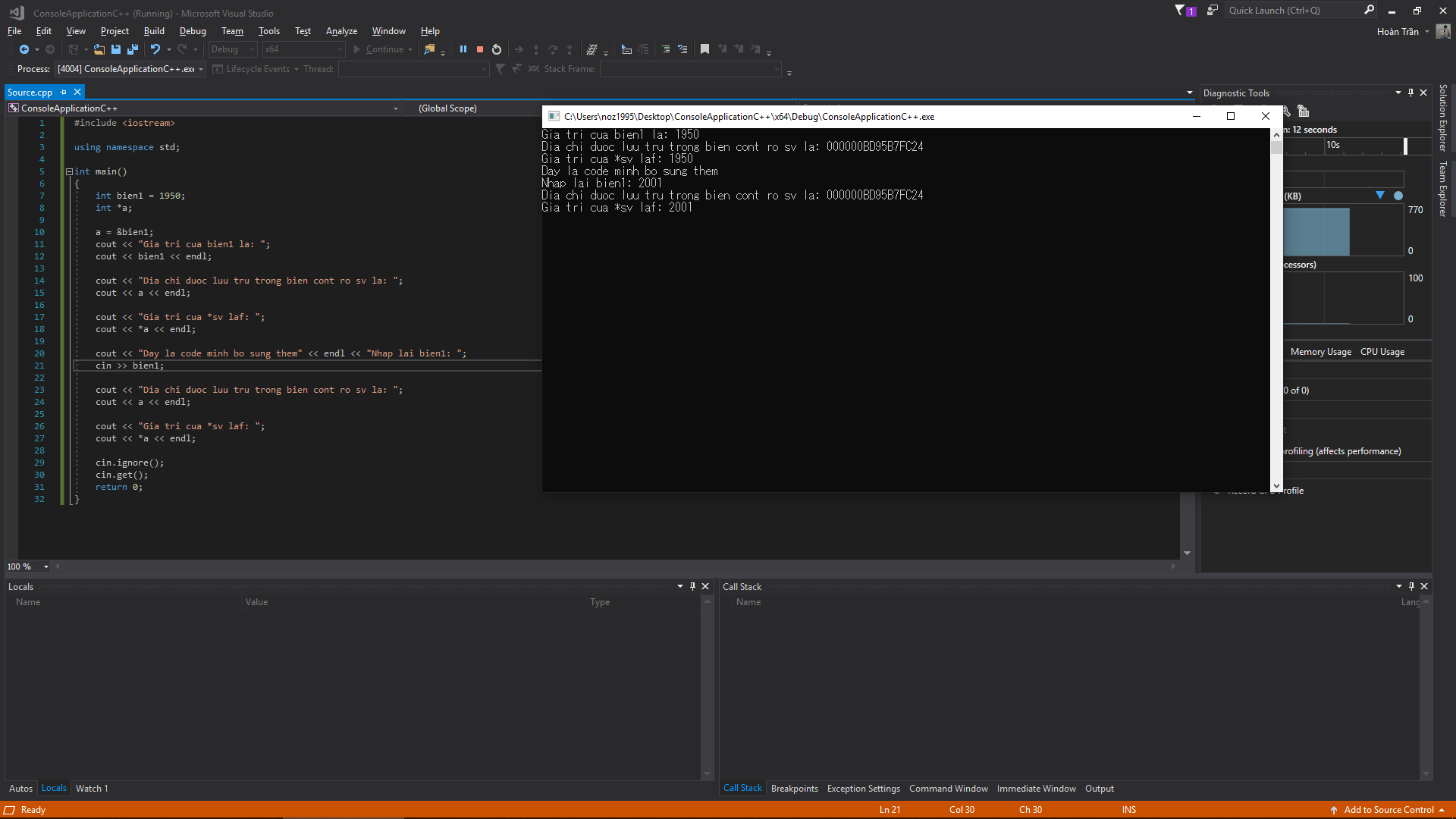 Bây giờ e khai báo biến ‘‘bien1’’ bằng một giá trị khác nhưng tại sao địa chỉ con trỏ vẫn k thay đổi vậy ạ???