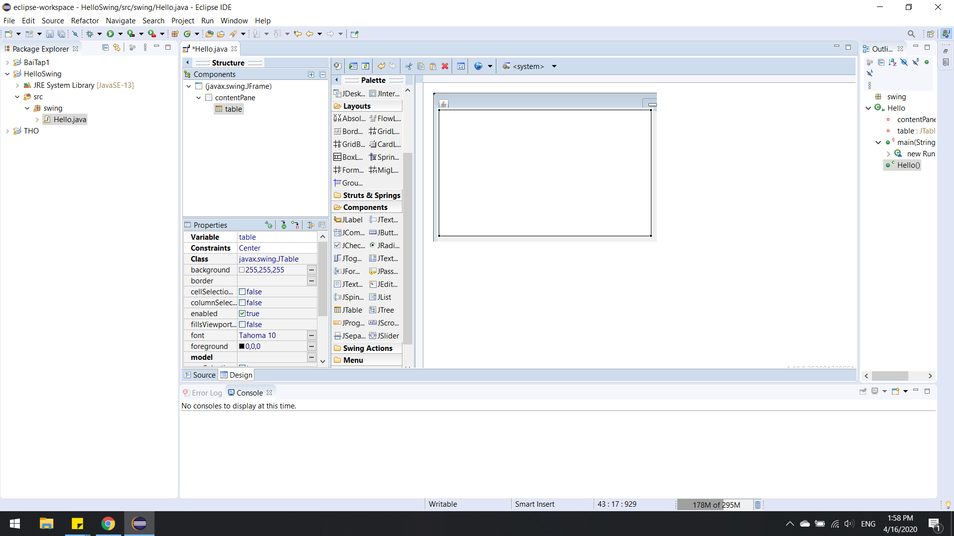 Em đang làm một ứng dụng trên desktop thì em có tìm hiểu java swing rồi em dùng windowbuilder mà sao lúc desgin mà cái frame trông như kiểu bị thiếu rồi em kéo cái jtable vào mà lại chả thấy gì ạ.Mn xem giúp em với ạ