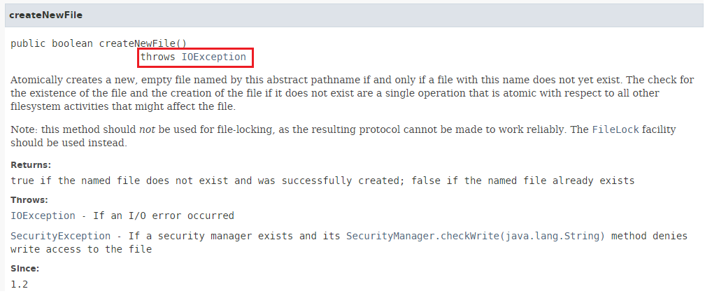 Theo documentation thì phương thức createNewFile() sẽ throws IOException.