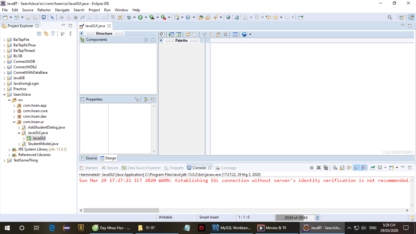 Do quen dùng eclipse code rồi nên em cũng mày mò dùng swing trên eclipse ạ ,em có làm 1 thao tác là tìm kiếm tên học sinh . giờ em muốn làm thêm 1 thao tác nữa là thêm học sinh vào nữa . Nhưng khi em ấn vào Design để thêm button add thì desgin của em nó không hiện gì ra ạ . :(( lần trước em làm thao tác tìm kiếm thì vẫn bình thường ạ . Ai có biết gì về trường hợp này chỉ giáo em với ạ