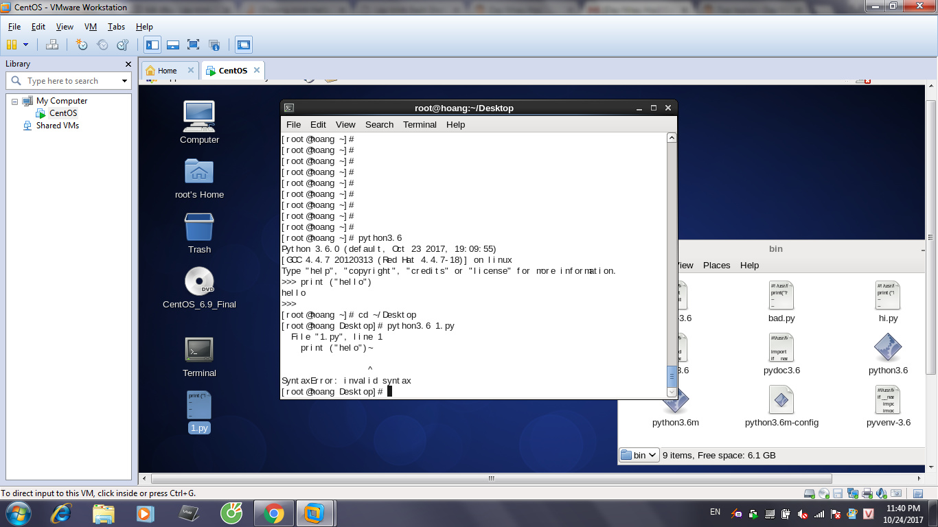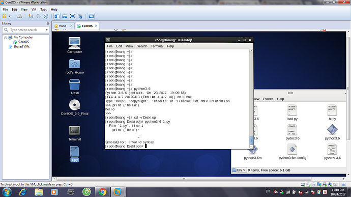 Em mới tập học Python,em còn rất kém…mong ace bỏ qua … em cài centos 6 trên máy ảo đã cài python 3.6, khi làm bài print “hello” đầu tiên thì ko in ra hello mà hiện như hình, nhờ ace hổ trợ giúp…em cám ơn!