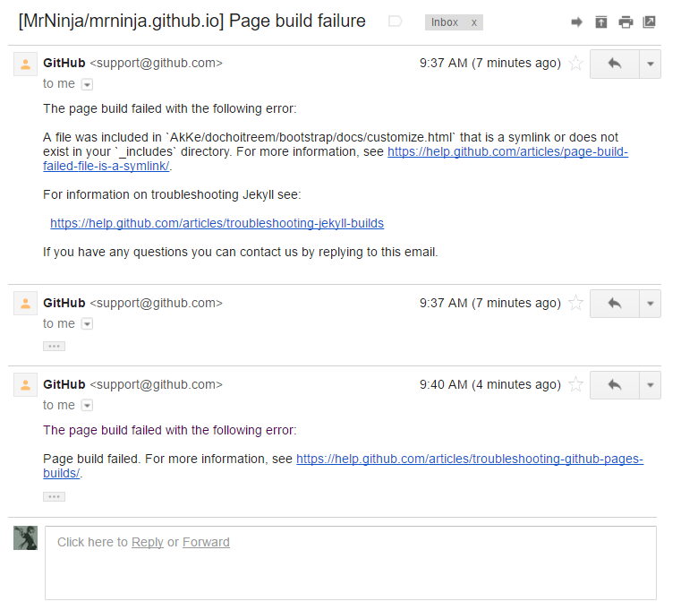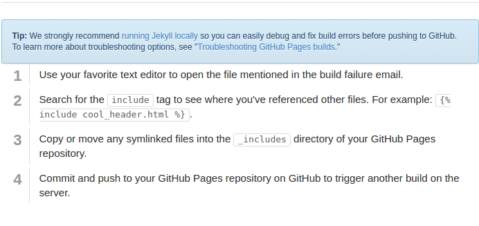 If your GitHub Pages site fails to build because of a reference to a symlinked file, you’ll get an email that looks like this: