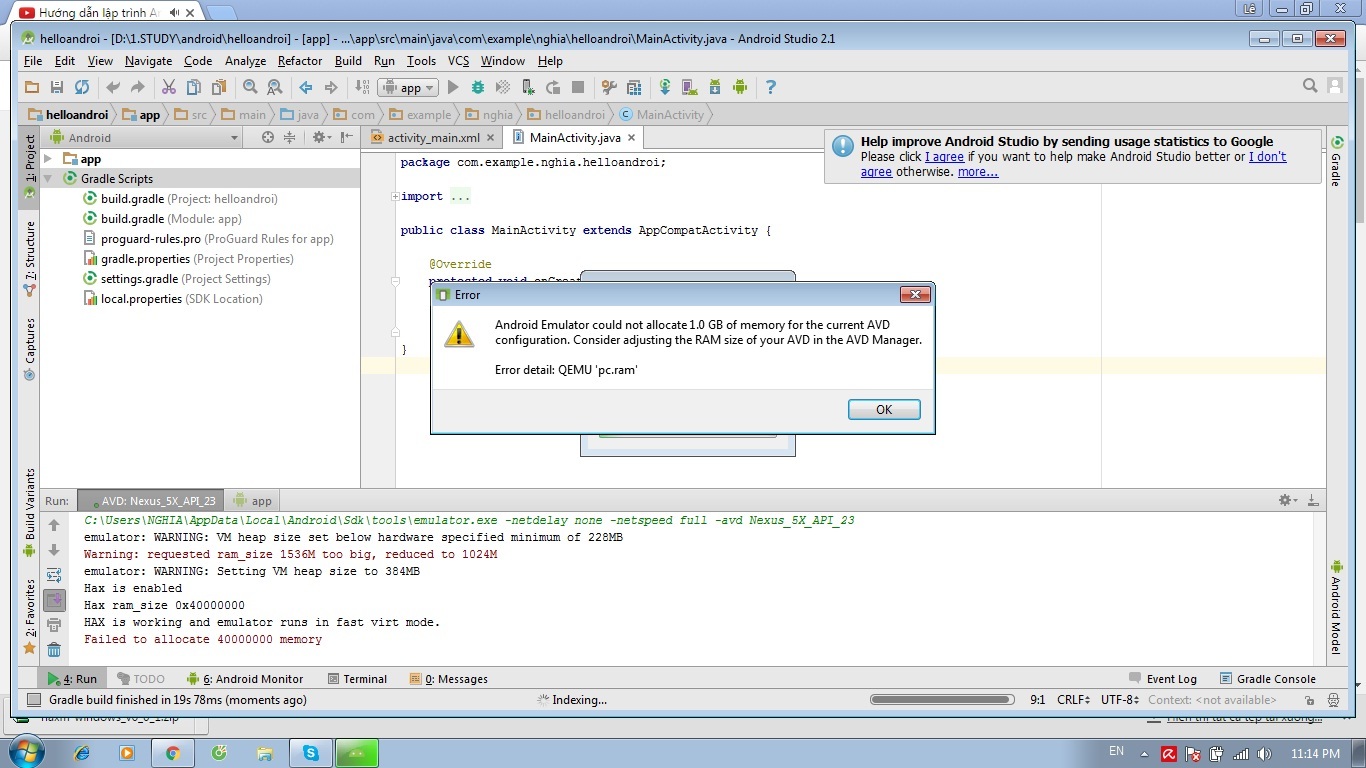 Chào mọi người, em mới cài androi studio. Khi chạy thử chương trình hello world thì thấy lỗi như sau: