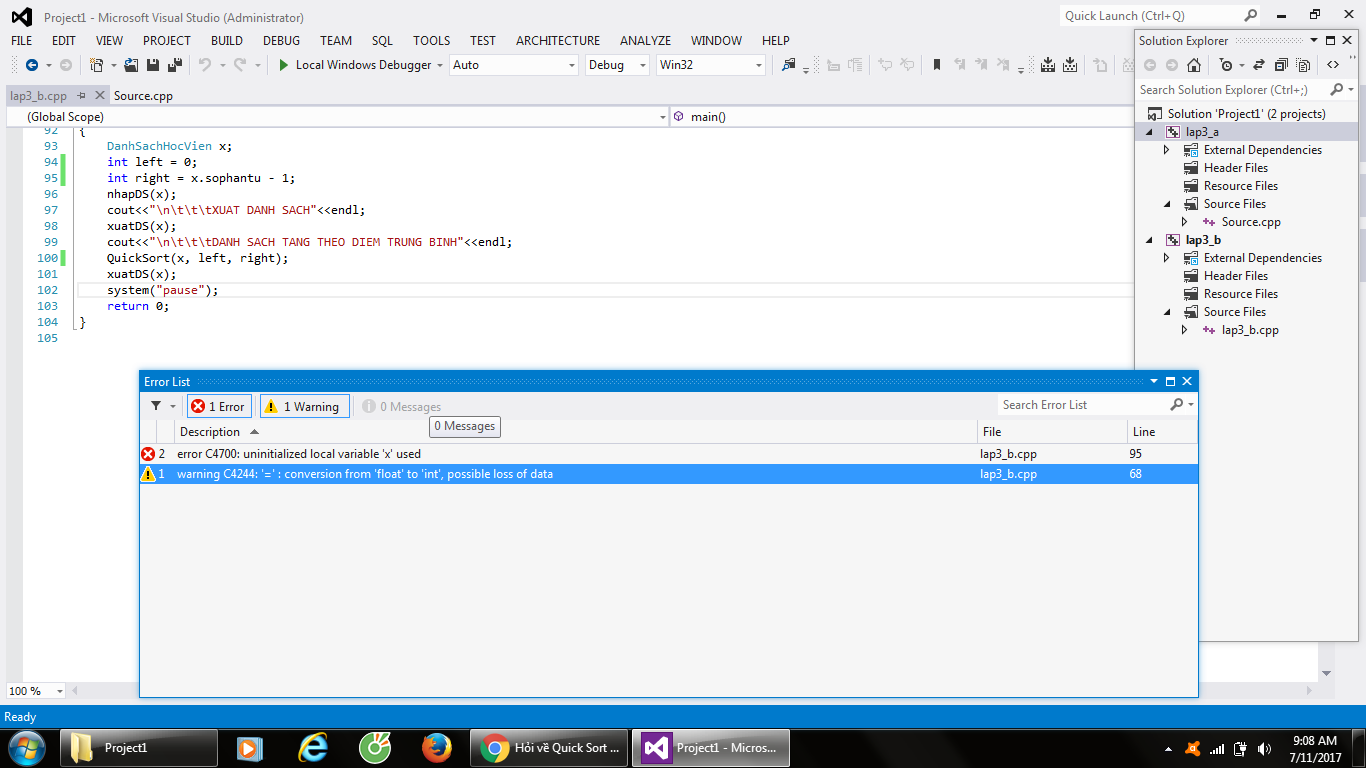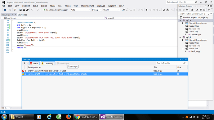 vậy này, tui không dùng Quick sort thì nhập danh sách và xuất danh sách bình thường, khai báo số lượng phần tử x.sophantu bỏ trong hàm main() hay trong hàm nhập đều được, còn khi viết hàm Quick sort thì tui phải khải khai báo thêm2 biên left và right.Khi đó khai báo x.sophantu bỏ trong hàm nhập thì nó báo lỗi biến cục bộ gì đó còn khi bỏ vào hàm main thi nó ko báo lỗi và chạy bình thường và sắp xếp đúng.