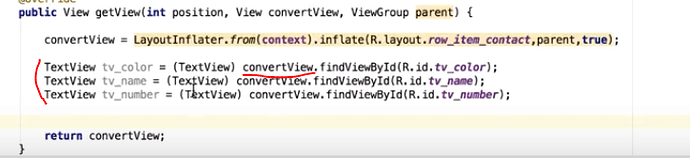 @beginnercplusplus convertView chứa tất cả các view được khai báo trong file xml, còn cái tv_color ở bên phải chính là id của view được khai báo bên trong file xml đó, đừng hỏi là không biết id của view trong lập trình Android là gì nhé. Đều là kiến thức nhập môn cơ bản cả thôi không có gì cao siêu cả đâu.