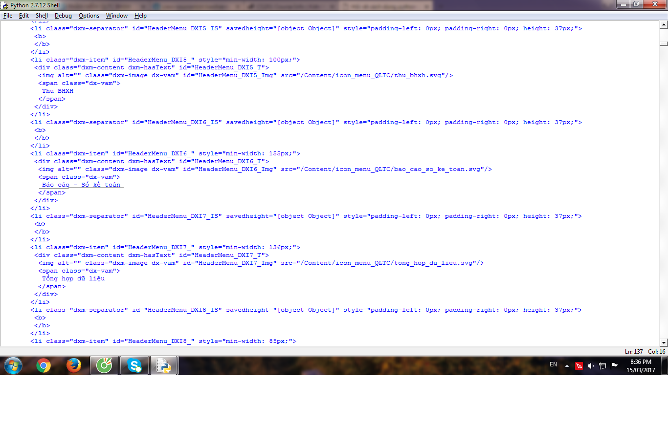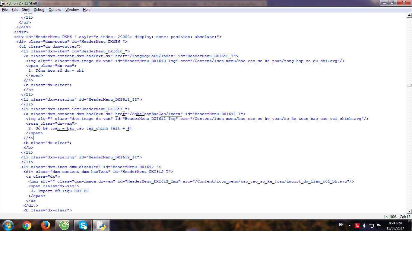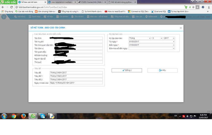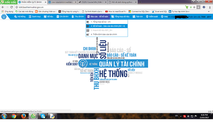 Khi đã đăng nhập được vào thì mình chỉ cần để trỏ chuột vào các thẻ tương ứng, tự động nó sẽ xổ ra các báo cáo cho mình, muốn xem báo cáo nào mình chỉ cần click vào báo cáo đó. ở đây e muốn xem “Sổ kế toán - báo cáo tài chính” nằm trong thẻ “Báo cáo - Sổ kế toán” . E chạy thử code thì thấy mục “Sổ kế toán - báo cáo tài chính” chứa ở link: href /SoKeToanBaoCao/Index (như hình H2).