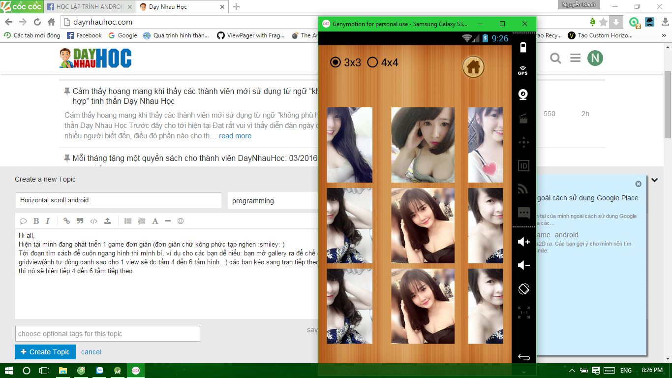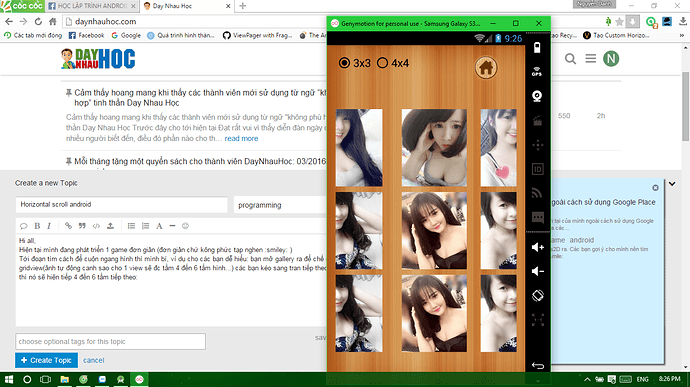 Tới đoạn tìm cách để cuộn ngang hình thì mình bí, ví dụ cho các bạn dễ hiểu: bạn mở gallery ra để chế độ gridview(ảnh tự động canh sao cho 1 view sẽ đc tầm 4 đến 6 tấm hình…) các bạn kéo sang tran tiếp theo thì nó sẽ hiện tiếp 4 đến 6 tấm tiếp theo:(đừng để ý tới nội dung mấy tấm hình nha -_- )