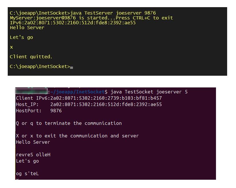 As extensions of Java Socket and ServerSocket, the two aforementioned sockets inherit all the functionalities of Socket and ServerSocket, respectively. Programming examples: