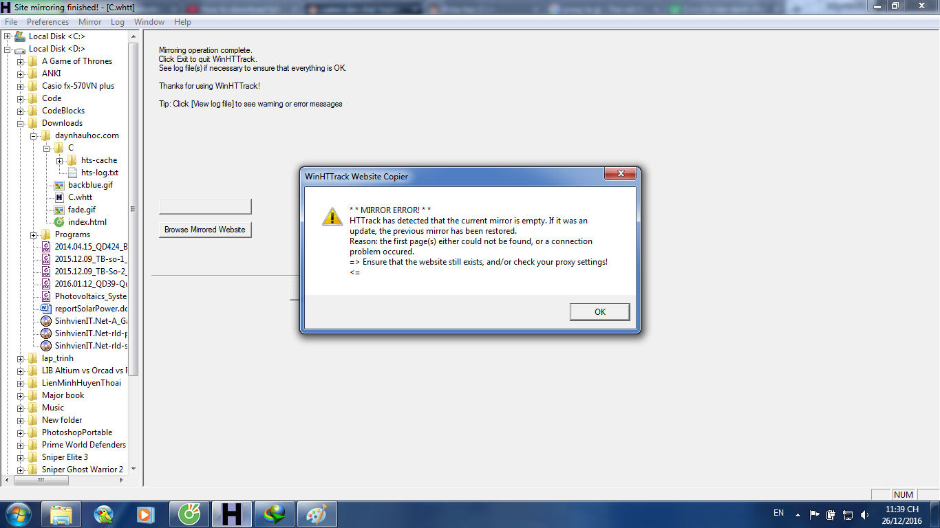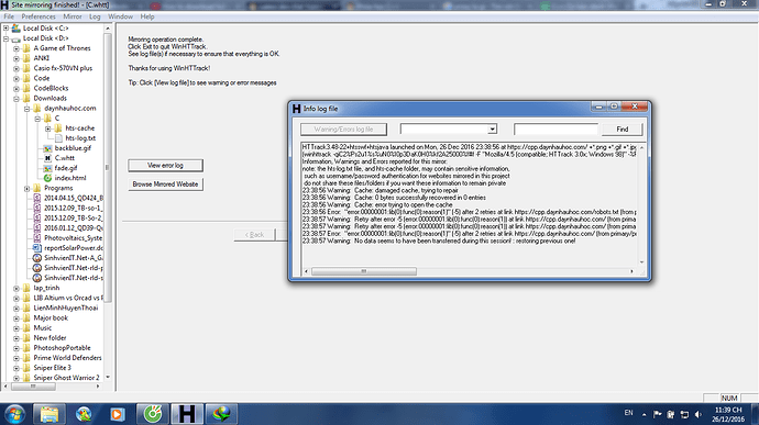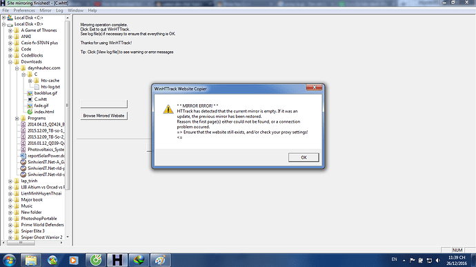 Minh xài phần mềm httrack để save offline trang này https://cpp.daynhauhoc.com/ theo hướng dẫn video sau https://www.youtube.com/watch?v=uqJNjb-zg3s tuy nhiên gặp phải lỗi.