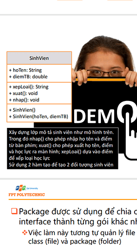 Thì trong hàm main ta viết. Sinhvien a = new Sinhvien(); Sinhvien b = new Sinhvien(“ten”,10); viết 2 cái constructor này cho class
