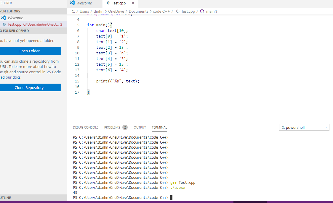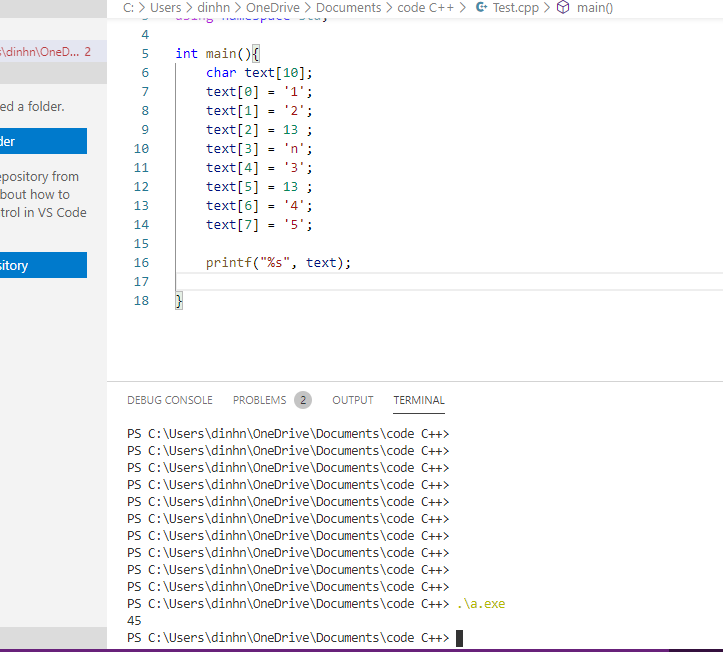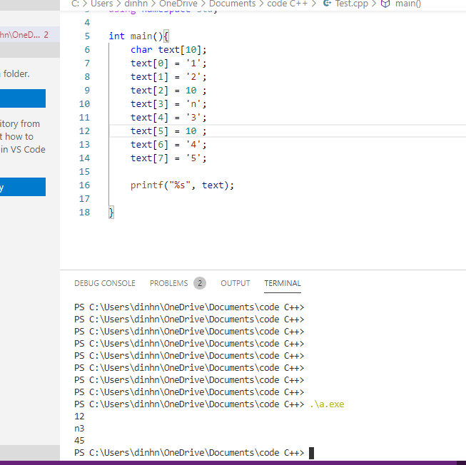 Em đang thắc mắc tại sao khi em dùng kí tự “Chuyển dòng/ Xuống dòng” ở giữa mảng char thì em lại nhận được kết quả như hình ạ