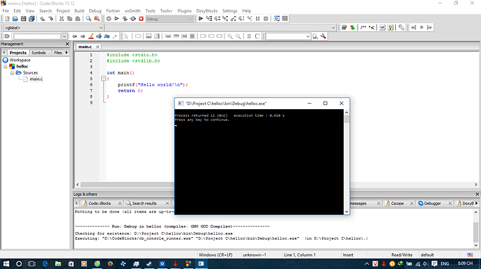 Em đã xem clip hướng dẫn học lập trình c nhưng khi build and run thì lại không hiện lên chữ hello world mặc dù đã có lệnh print